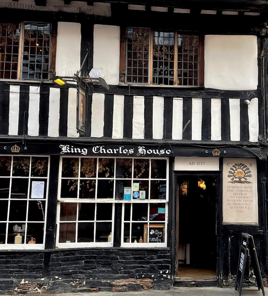 Ah 1651! In this year our beloved King is believed to have made his escape from the very building that highlights this date, after losing the final battle of the English Civil War. After the Battle of Worcester in September 1651 ended in defeat for Royalist forces, residents of New Street held off Cromwell’s soldiers so that Charles could make his escape from the house. Since then, the building has been a judge’s residence (that included its own dungeon!), a furniture-makers, an antiques shop, and a restaurant.
