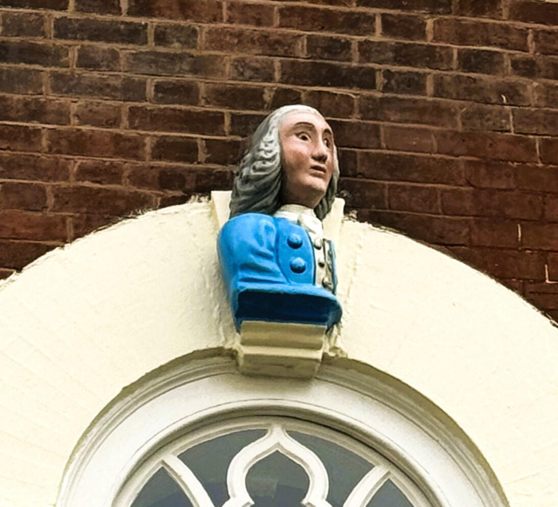 You looked up and spotted the three heads/faces that look out from the Cocky Anchor pub out into Broad Street, in fact the building they are mounted on is one of the quirkiest in Worcester. 61 Broad Street was known as the Cupola House, and it is believed that it was lived in and maybe even built by 18th century artist Joseph Blackburn. There are in fact 6 storeys from the cellar to the domed Gothic belvedere on the roof but is only a single bay wide. Above the pub's frontage, three Venetian windows are surmounted by a painted head, maybe recalling characters Blackburn met on his travels across the Atlantic?