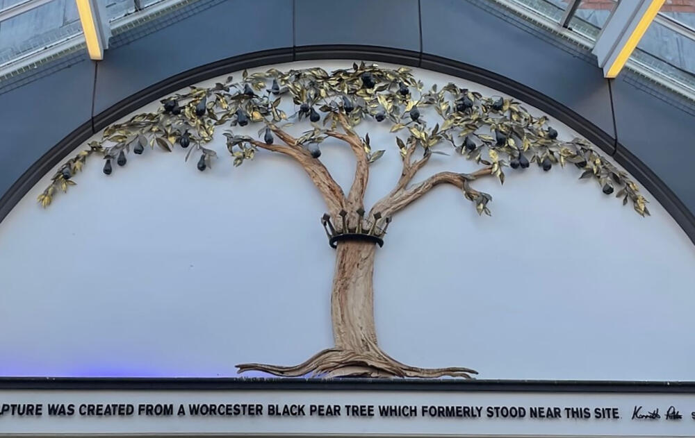 This piece of artwork was sculpted from a Worcester black pear tree which used to stand near to the spot the artwork now resides. It was created by Kenneth Potts who used to work at the world-famous Worcester Porcelain as a modeller. The Museum of Royal Worcester is well worth a visit, trace your steps back to clues 10 & 11 to find the location - plus check out the following link for more information, Click Here.