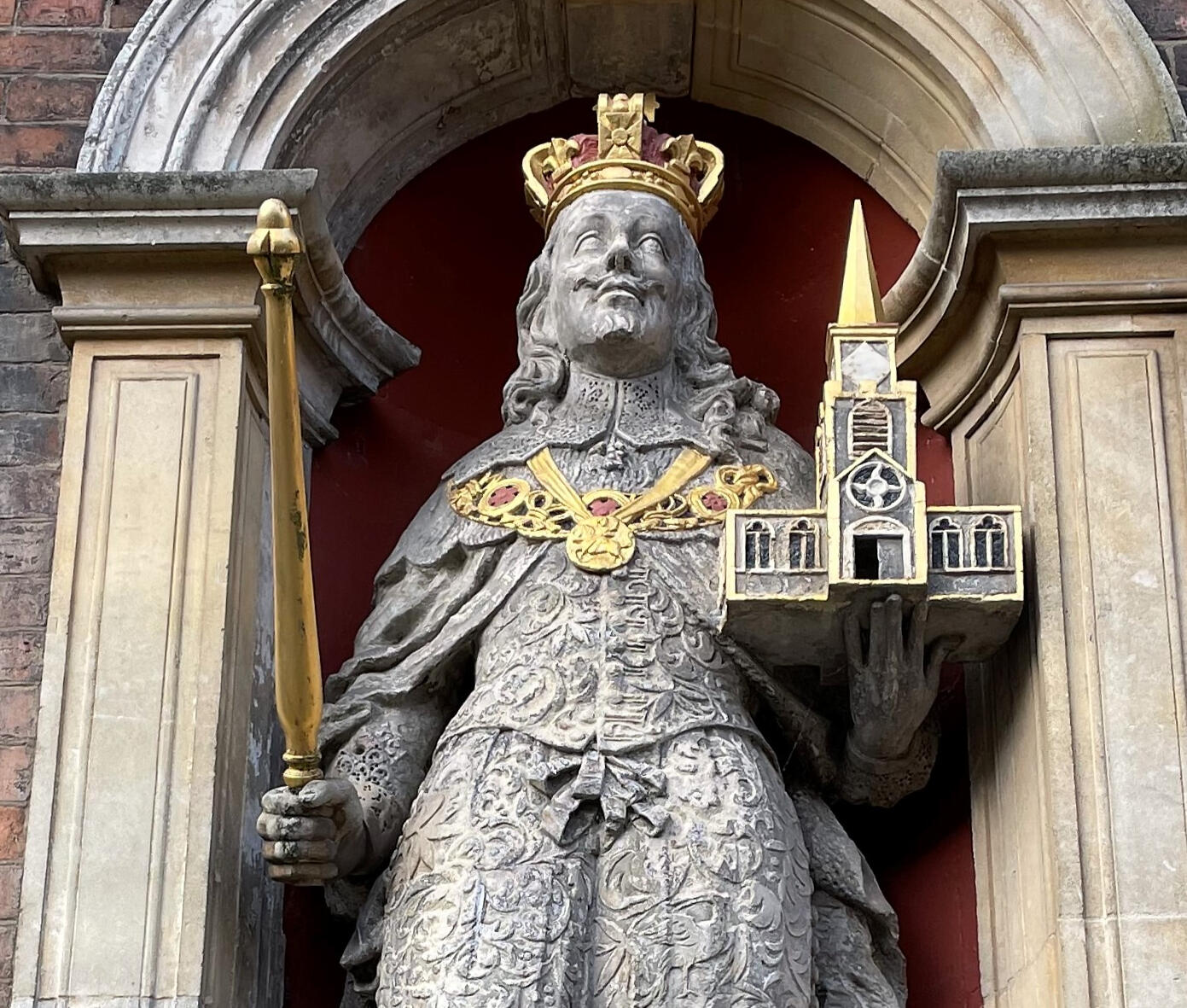 You’ve spotted Charles I (his son, Charles II, our King in this quest, is on the opposite side of the entrance) at the front of the Guildhall and hopefully answered that he holds a church in his left hand. The original guild of merchants would not recognise the building now, back then it was a large, timber-framed building with a piazza for shops fronting the street, courts of justice at each end, and a prison to the north of the building. Within the prison there was a cell called the ‘peephole’, which gained a notorious reputation. There was gaoler’s house, with an alehouse attached, from where the gaoler sold ale at an extremely high price to any prisoner who could afford it!